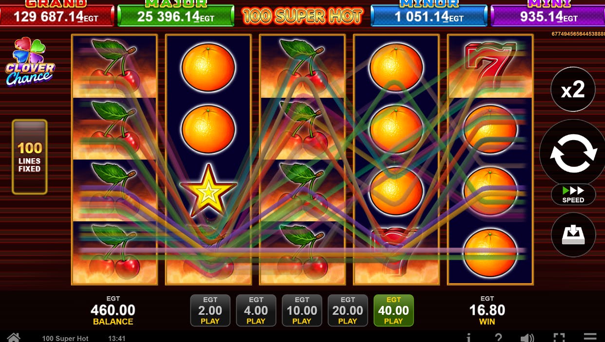 Dotata di una grafica ordinaria con qualche animazione legata al fuoco, 100 Super Hot è una slot che sorprende nelle meccaniche di gioco e nel gameplay. Partiamo delle linee di pagamento, ben 100, disposte su una griglia 5×4 che accoglie simboli quali arancia, ciliegia, limone, prugna e anguria. L’uva è il simbolo più remunerativo tra quelli regolari, arrivando a pagare 4 volte la scommessa. Anche i simboli speciali sono paganti, a partire dal Wild, che ha funzione di jolly e sostituisce tutti i simboli eccetto lo Scatter. Il simbolo più generoso in assoluto è però la stella, lo Scatter, che ripaga con una somma monstre di 500x.