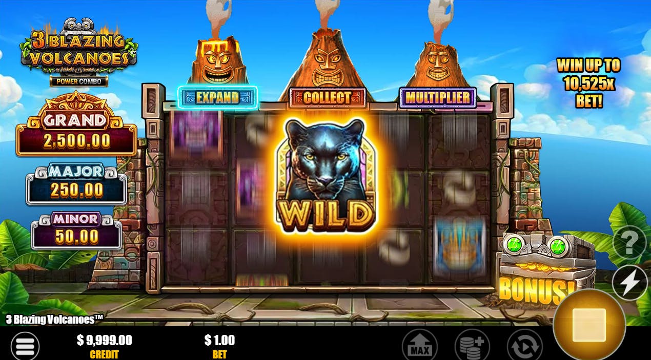 Appena si accede alla schermata principale di 3 Blazing Volcanoes™ Power Combo, si viene colpiti dalla grafica in stile cartoon con colori vivaci e ottime animazioni a dare movimento al gioco.
