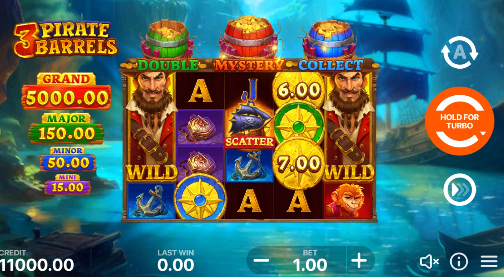 Di seguito una panoramica delle funzioni più diffuse di cui dispone 3 Pirate Barrels: Hold and Win.