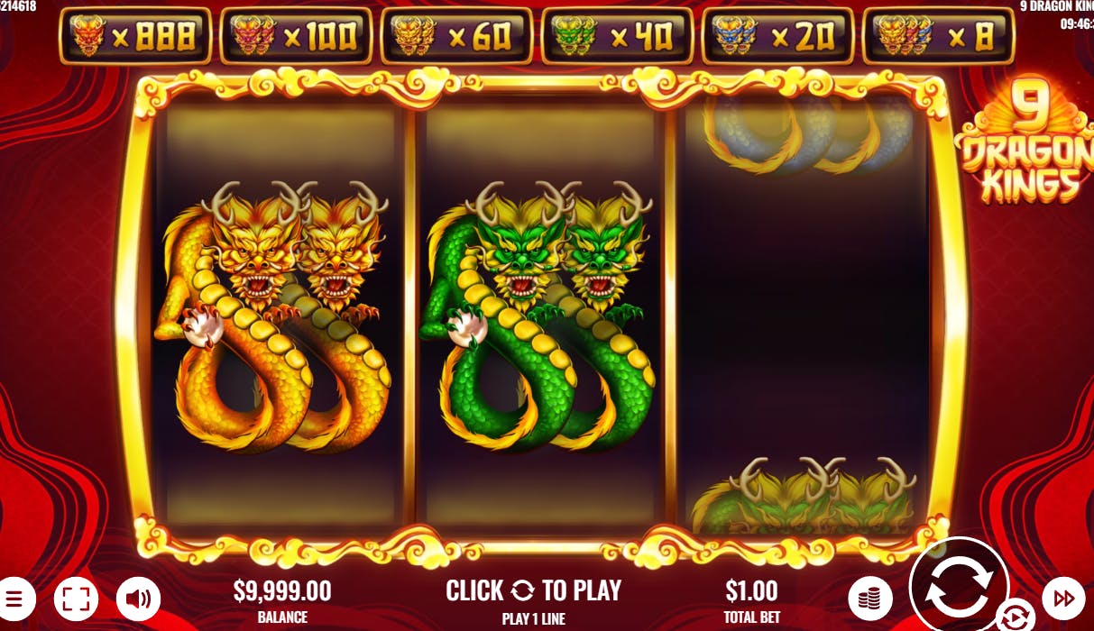 Se amate le slot poco complesse ma allo stesso tempo coinvolgenti, segnatevi 9 Dragon Kings, nuovo titolo del provider Platipus. La grafica ben curata utilizza come sfondo il colore rosso che contrasta con i colori brillanti dei draghi, simboli principali del gioco. Ci sono 3 rulli e un’unica linea di pagamento, su cui possono atterrare quattro coppie di draghi di colore diverso. Se quelli di colore blu pagano 20 volte la scommessa e quelli verdi 40, si ottengono somme più alte con quelli oro (60x) e soprattutto con i rossi, ben 100 volte la puntata. Le combinazioni vincenti non devono avvenire per forza con i draghi dello stesso colore, ma possono essere anche miste. I pagamenti in questo caso sono più bassi, pari a 8x.