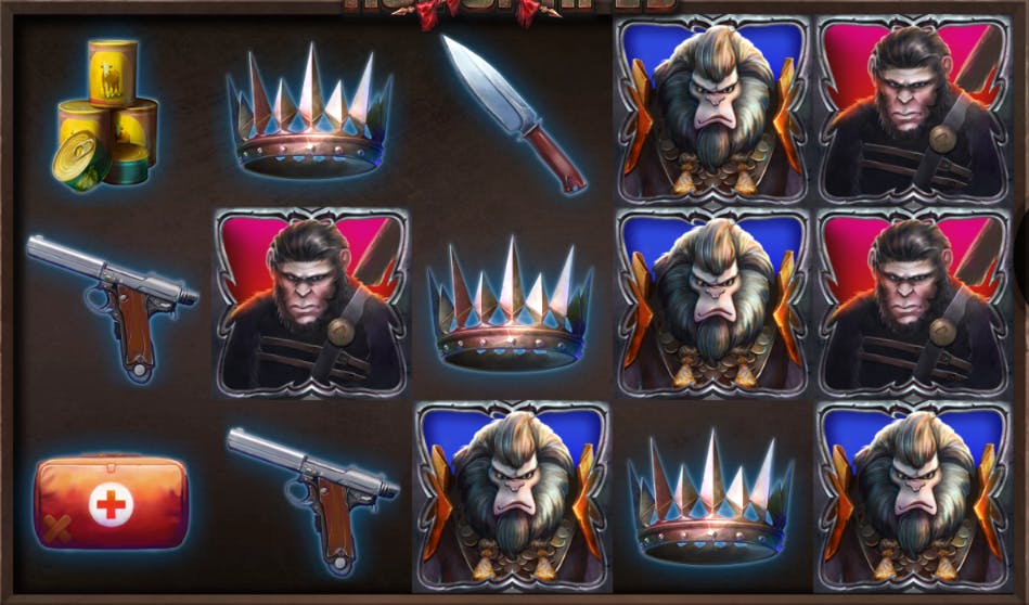 Questa slot di WorldMatch ha tutto ciò che un gioco deve avere. L’ambientazione in un futuro distopico in cui le scimmie hanno preso il controllo del mondo è di forte impatto, anche grazie a un livello grafico adeguato alla spettacolarità del tema. La griglia ha una conformazione classica con 5 rulli e 3 righe, le 10 linee di pagamento sono sufficienti a creare ottime combinazioni vincenti. Wild e simboli moltiplicatori danno una marcia in più alle partite, ma ad alzare il livello ci sono i simboli Bonus. Con 3 simboli Bonus si ottengono 5 Free Spins, con 4 simboli Bonus si partecipa a un gioco speciale che mette in palio moltiplicatori compresi tra 20 e 250.