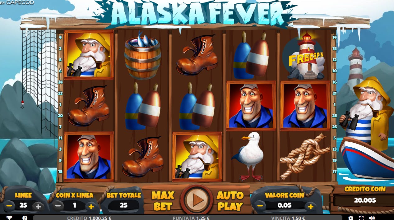 La Capecod ha da poco rilasciato Alaska Fever, secondo capitolo di una serie che ha come protagonista un vecchietto avido di avventure. Il gioco, impreziosito da una grafica di primissima qualità in stile cartoon, presenta una griglia 5×3 con 25 linee di pagamento modificabili. I simboli regolari con cui creare le combo sono 9, a cui si aggiungono 2 Wild. Giocheremo quindi con l’amo, la corda, il gabbiano, i galleggianti, lo stivale, la botte e i tre componenti dell’equipaggio. I simboli Wild sostituiscono tutte le icone eccetto quelle speciali. Il primo Wild è un granchio ed è pagante, anzi è il simbolo più generoso del gioco; il secondo Wild è il Marlin ed è un semplice Jolly.