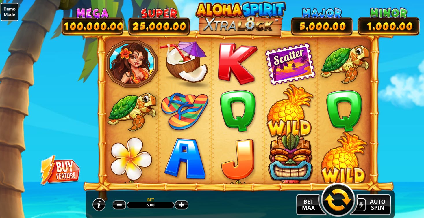Giocare con la slot Aloha Spirit XtraLock è come fare un tuffo nel mare incantevole delle isole Hawaiane. La griglia 5×3 ospita 50 linee di pagamento fisse su cui allineare da 3 a 5 simboli identici per ottenere una vincita. I simboli in gioco sono le carte da poker, le ciabatte, i fiori, i cocktail e la tartaruga marina. Al primo posto troviamo la ragazza che paga anche con due soli simboli. L’ananas è il Wild, sostituisce tutti i simboli eccetto quelli speciali. Lo Scatter è il simbolo che dà accesso al gioco bonus. Se ne atterrano 3 si ricevono 12 free spins durante i quali il rullo centrale è interamente occupato da Wild.