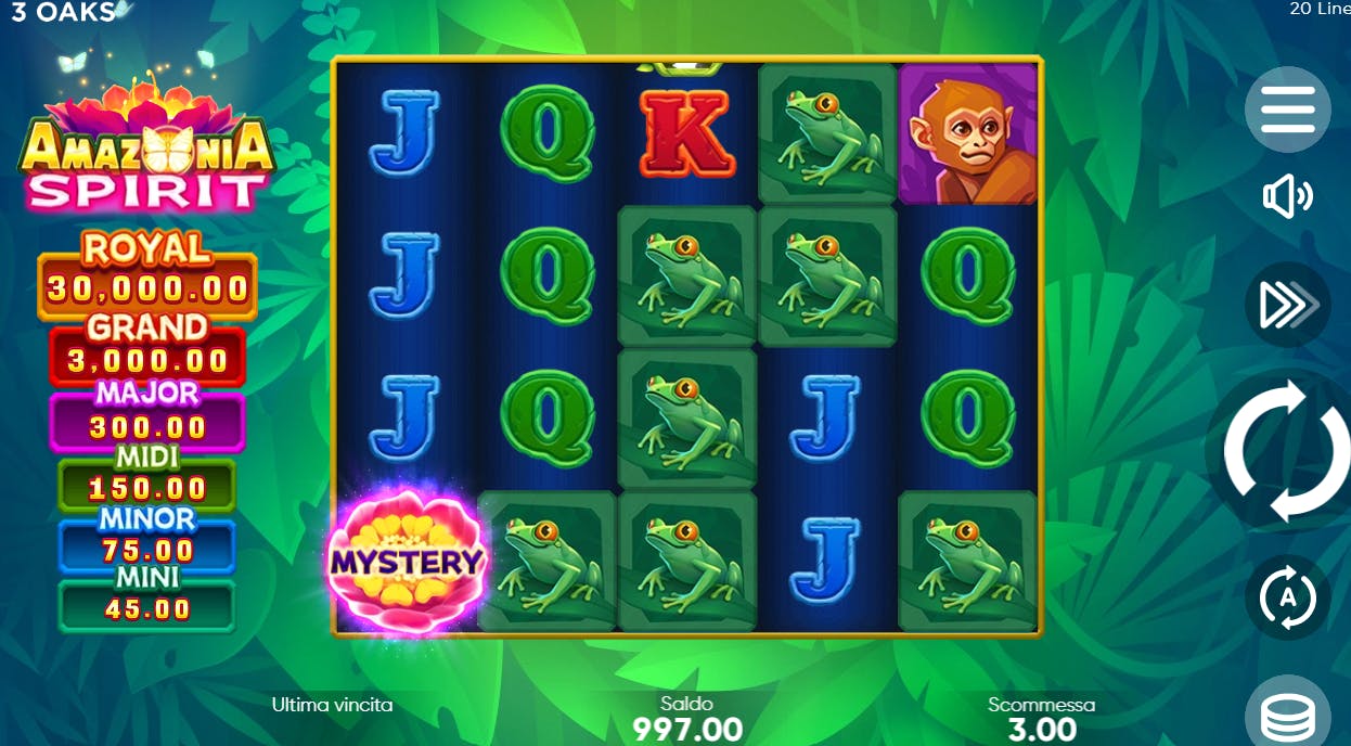 La slot Amazonia Spirit convince sotto tutti i punti di vista, a cominciare dalla grafica raffinata in cui le varie tonalità di colore riescono creare un’atmosfera d’impatto. La griglia 5×4 ha 20 linee di pagamento fisse su cui creare le nostre vincite. I simboli ad alto pagamento sono quelli tematici (giaguari, tucani, rane, scimmie, serpenti e fiori tropicali), quelli a basso pagamento sono le carte da gioco dal J all’A.