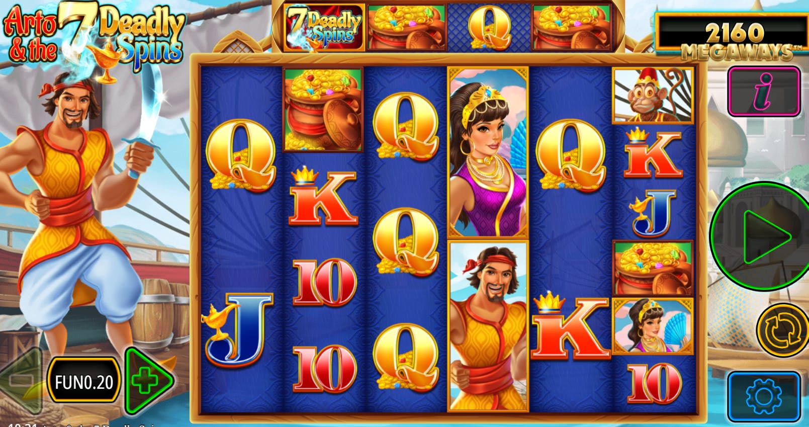 Arto è l’eroe di questa slot e ti accompagnerà a bordo di un vascello: lo vedrai stagliarsi per tutto il tempo sulla sinistra dello schermo mentre volteggia la sua scimitarra. Sullo sfondo campeggiano alcune costruzioni orientali del porto dov’è ancorato il vascello. Una melodia incalzante fa da sottofondo al gioco, mentre gli effetti sonori diventano più intensi quando si attivano i free spins e le funzioni speciali e quando ottieni una vincita.