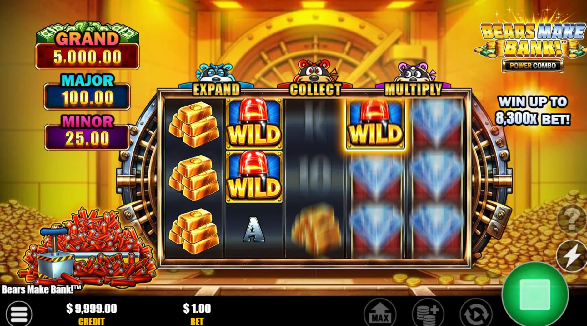 Il gioco presenta un layout standard con 5 rulli, 3 righe e 40 linee di pagamento fisse su cui costruire le combo vincenti. La vincita massima di Bears Make Bank! Power Combo è di 8.300 volte la puntata, con il diamante, i lingotti d’oro e le mazzette di denaro a formare il gruppo dei simboli maggiormente remunerativi.