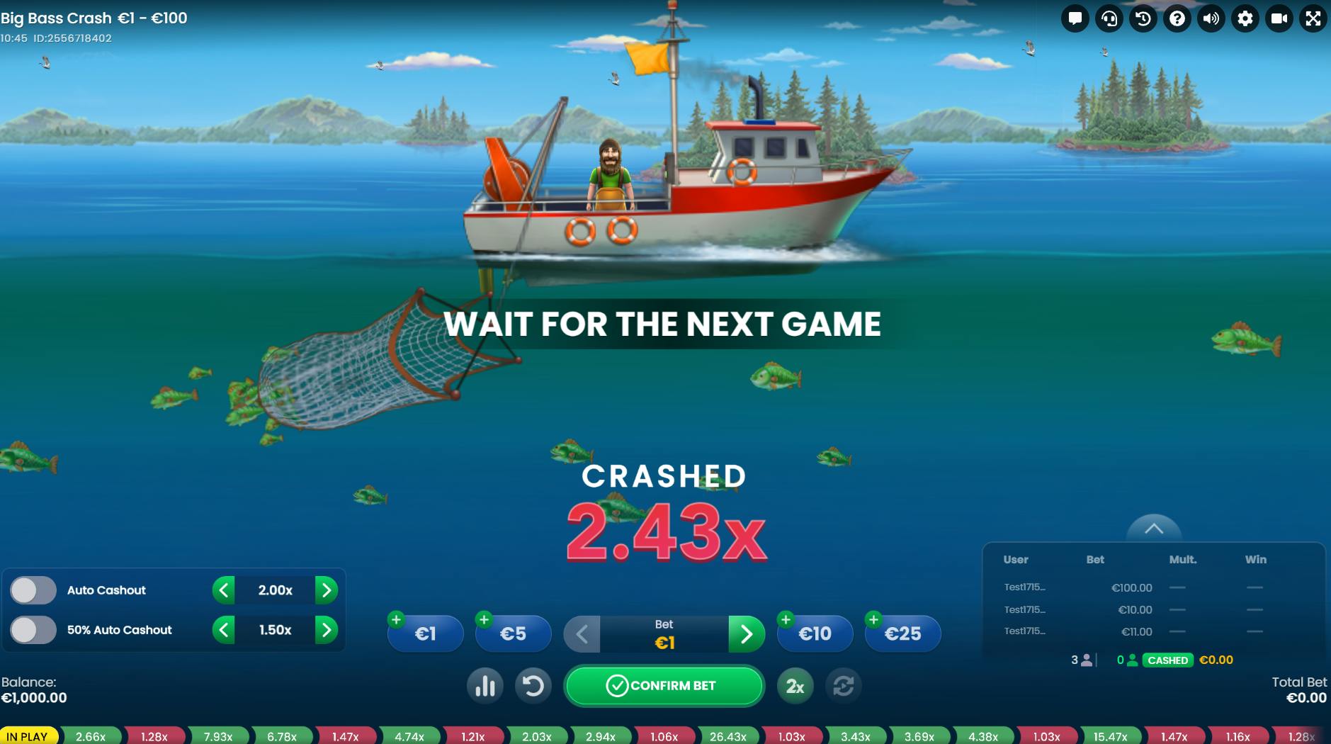 Per effettuare una partita a Big Bass Crash devi puntare minimo 1 €.