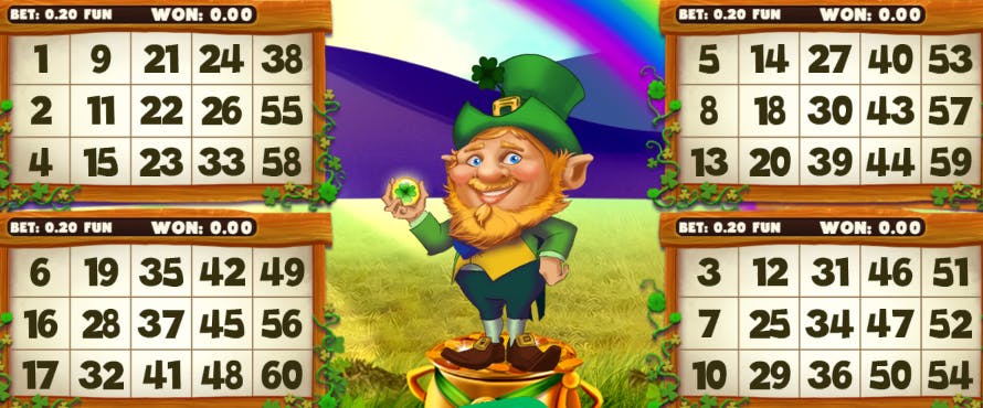 La schermata principale di Bingo Trevo da Sorte si apre su una vallata tipica irlandese, con un prato verdeggiante e un arcobaleno che sbuca dai monti in lontananza. Al centro ci sono invece le 4 cartelle numerate con cui giocare e su cui piazzare le nostre scommesse, ma nel caso siano troppe se ne possono utilizzare meno. Dopo aver cliccato il tasto Start verranno rilasciate 30 palline numerate con cui formare le combinazioni sulle cartelle. Queste combinazioni non sono altro che linee di pagamento a cui è associato un premio o un bonus game.