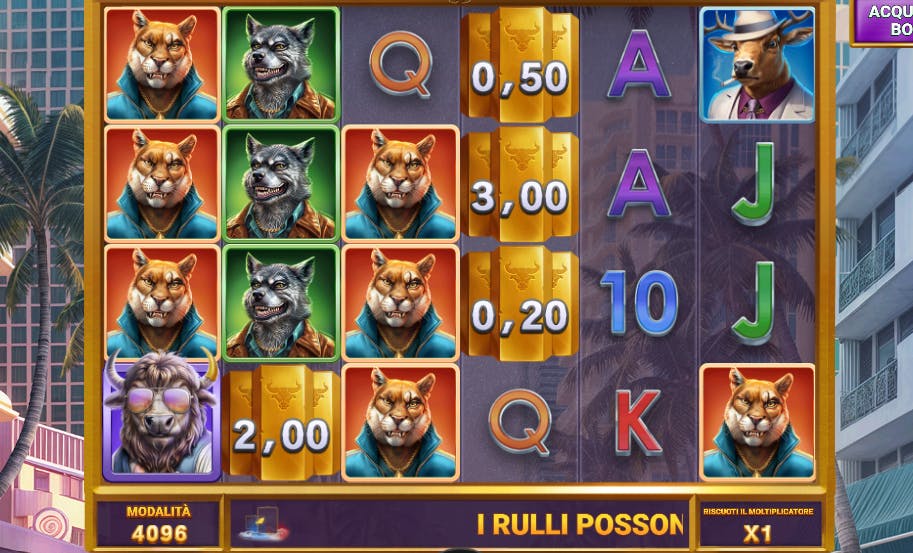 Le strade soleggiate di Miami fanno da sfondo a Buffalo Blow, slot a tema crime con protagonisti animali dalle fattezze umane. La grafica, precisa e ben elaborata, supporta un gameplay coinvolgente caratterizzato da una griglia 6×4 con 4096 modi per vincere. Come vedremo a breve, il layout può espandersi sino a 6×8 e i modi per vincere salire sino a 262.144. In questo modo le possibilità di ottenere vincite potenziali aumentano a dismisura.