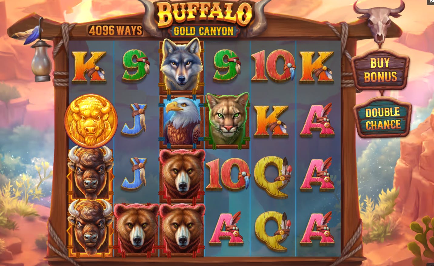 In un mondo dominato dalla natura indomita, dove il sole arroventa il suolo e i bufali corrono liberi, Buffalo Gold Canyon porta tutta l’intensità del Wild West sui rulli. Questa slot a 6 rulli e 4 file è un concentrato di azione pura, con 4096 modi per vincere e simboli che raccontano la storia di un paesaggio epico: lupi, aquile, bufali maestosi e la forza della natura in tutta la sua grandezza.