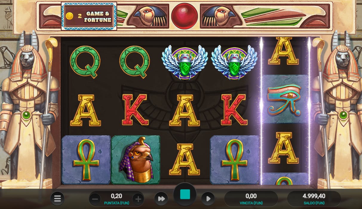 A prima vista Curse of Ra può sembrare una slot ordinaria dalla grafica pulita, con una griglia tradizionale 5×3 e 20 linee di pagamento. I simboli regolari che possono atterrare sono le solite carte da gioco (J, Q, K, A) e icone tematiche quali la chiave della vita, l’occhio di Rá, il dio Anubi e il dio Horus.