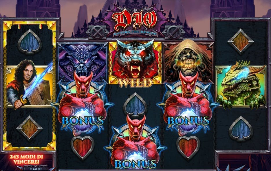 La slot è interamente basata sull’album Killing the Dragon della band heavy metal Dio, infatti potrai giocare e cercare di vincere molti soldi sulle note delle canzoni più famose del disco. Tra i simboli della griglia troverai classici simboli delle carte da gioco ma anche il frontman della band con una spada, draghi, lupi e mostri, il tutto posto su uno sfondo infernale dominato da un drago, che dovrai cercare di sconfiggere con tutte le tue forze.