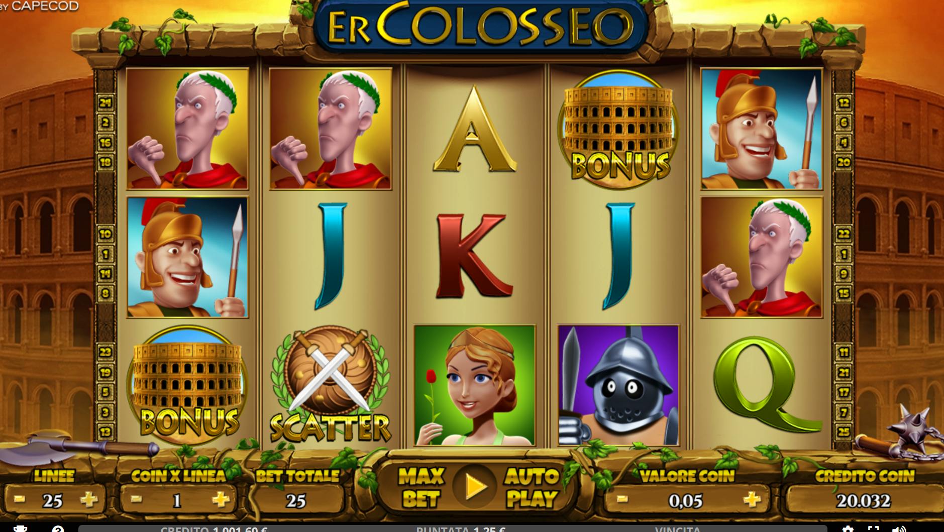 Ambientata nella Roma imperiale, Er Colosseo è una slot dal forte impatto visivo grazie a una grafica elaborata nei minimi dettagli. Alle spalle della griglia 5×3 non poteva che esserci sua maestà il Colosseo, vero e proprio simbolo della città. In questo gioco si potranno usare 25 linee di pagamento modificabili, quindi sarete voi a scegliere di volta in volta quante utilizzarne. I simboli base sono solo 8, con i reali dalle carte da gioco a sistemarsi nel gradino più basso della scala di valore. Il gladiatore, il centurione, la bella ragazza e l’imperatore sono invece i simboli maggiormente remunerativi. L’aquila imperiale è il Wild e sostituisce tutti i simboli ma non le due spade incrociate, ossia lo Scatter a cui si deve l’attivazione dei Free Spins.