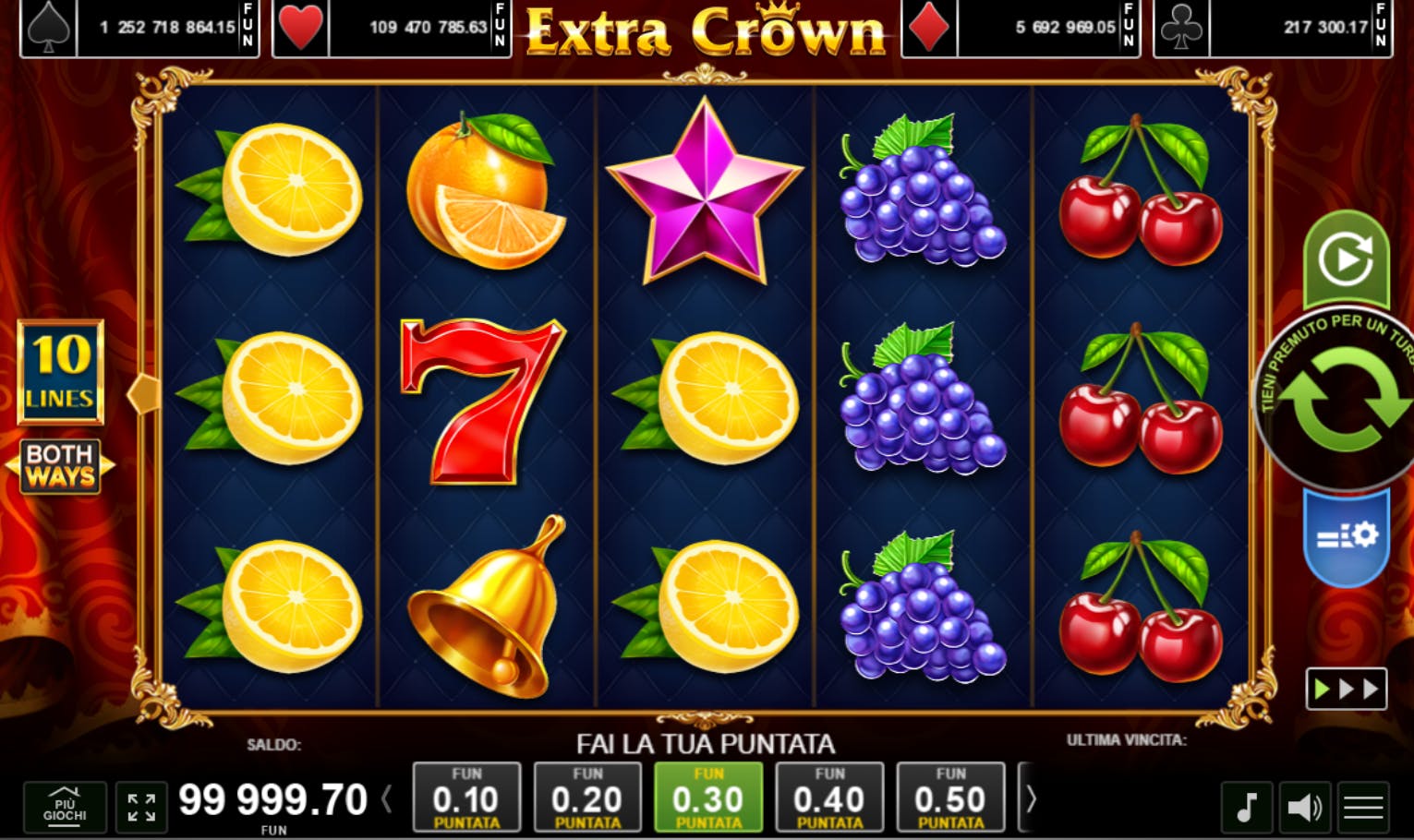 Con Extra Crown, il provider Amusnet ci regala una slot dal tema tradizionale e con una grafica superlativa in cui la frutta sembra appena colta dalla pianta. La tendenza alla tradizione la si ritrova anche nella griglia di gioco 5×3 con 10 linee di pagamento fisse, 6 simboli regolari, un Wild e due Scatter. Ciliegie, limone, arancia e prugna hanno tutti lo stesso valore, mentre la campana, l’uva e l’anguria pagano di più. Il simbolo più remunerativo è il numero 7 e arriva a pagare sino a 500 volte la puntata. C’è poi la corona, il Wild, e sostituisce tutti i simboli eccetto gli Scatter. Essendo a espansione, ricopre il rullo di competenza aumentando la possibilità di ottenere ottime vincite.