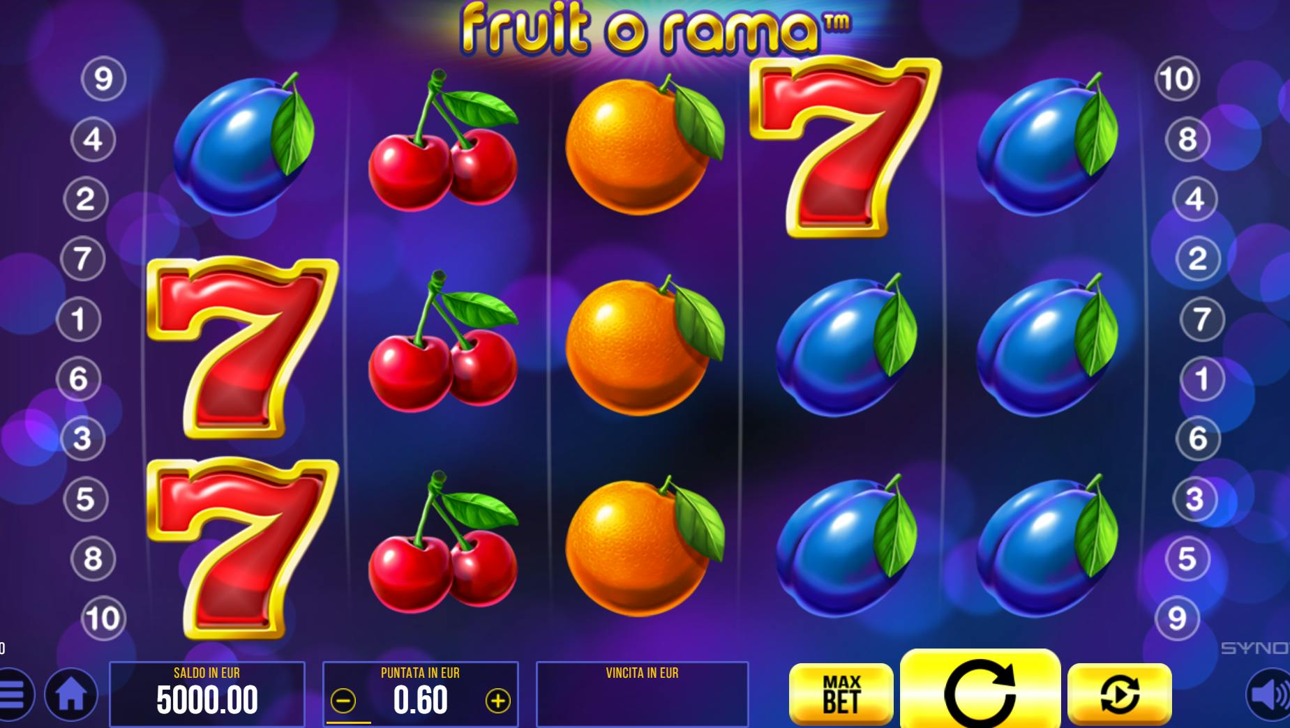 Con Fruit O Rama, Synot Games è riuscita nell’impresa di creare una slot a tema frutta che risulti fresca e originale. La puntata minima è di 0,10 €, ma può essere portata sino a 200 €. Tra i simboli regolari, il 7 regala la vincita più alta, pari a 8x. Il Wild ripaga invece con 10x se sui rulli ne atterrano 5 durante lo stesso spin. Gli Expanding Wild occupano l’intera bobina e ricompensano con un respin durante i quali rimangono in posizione. Nel caso tutta la griglia sia coperta da Expanding Wild, viene assegnato un giro extra che assicura una vincita di 200x. Il tasso di RTP è del 96,95%.