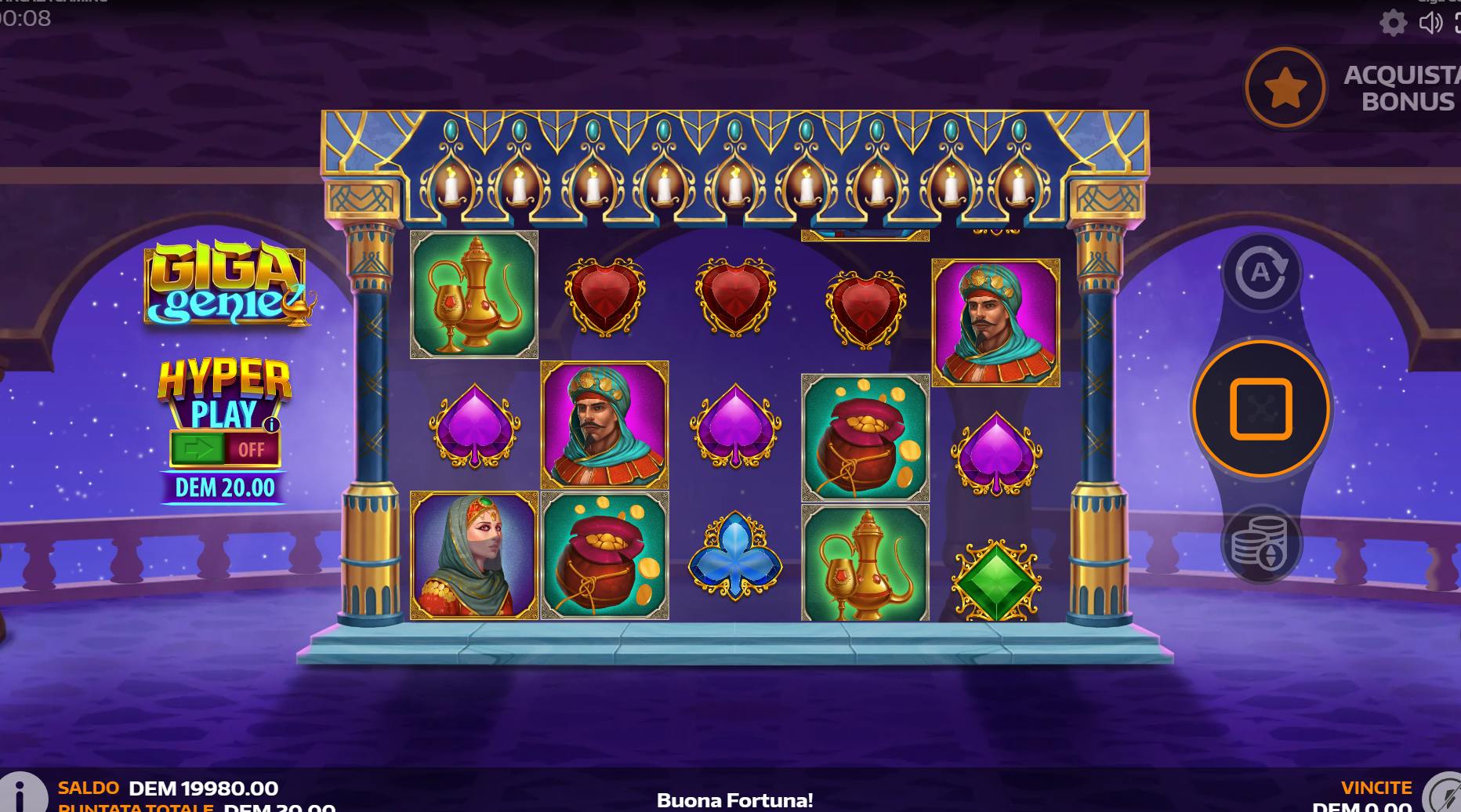 La terrazza di un sontuoso palazzo che si apre su un meraviglioso cielo stellato è lo scenario in cui si svolge la slot Giga Genie. La griglia di gioco 5×3 ha 10 linee di pagamento su cui costruire combinazioni vincenti.
