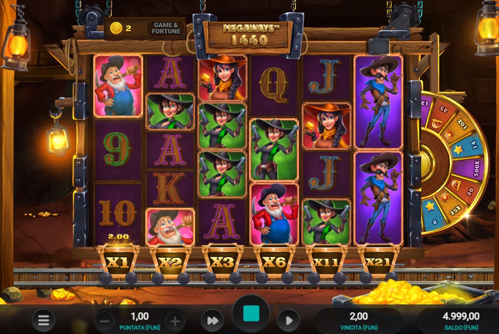 Con Gold Rush Frenzy, il provider Four Leaf Gaming ci offre una slot bella dal punto di vista estetico, con una grafica particolareggiata in cui ogni elemento contribuisce a creare la giusta atmosfera. Le partite si svolgono all’interno di una miniera d’oro, dove è collocata la nostra griglia di gioco a 6 rulli. Trattandosi di una slot Megaways, ogni bobina può accogliere da 1 a 7 simboli, generando di volta in volta un numero differente di modi per vincere. La quantità massima è di 117.649. Il gioco si avvale del meccanismo a cascata, per cui i simboli utilizzati nella creazione di una vincita scompaiono per far spazio ad altri simboli nuovi che potenzialmente potrebbero generare una nuova combo pagante. Le puntate vanno da 0,10 € a 20 €, con la possibilità di attivare i Nitro Spins, una sorta di puntata Ante che dietro pagamento aumenta la possibilità di ottenere Scatter e altri bonus. Consultando la tabella dei pagamenti, vediamo che le carte da gioco (dal 9 all’A) valgono poco, mentre i personaggi sono molto più generosi, arrivando a pagare sino a 50 volte la puntata!
