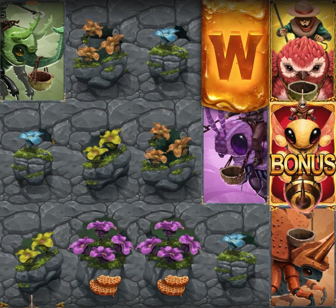 La griglia di gioco è una classica 5×3 con 243 modi per vincere su cui possono atterrare tre tipologie di simboli: basso valore, alto valore e speciali. I simboli meno generosi sono i fiori, quelli più remunerativi sono gli insetti, con l’uccello cardinale al primo posto di questa particolare classifica. Tra i simboli speciali ci sono il Wild e lo Scatter. Il primo sostituisce tutti i simboli base, il secondo, rappresentato dall’ape regina, attiva la funzione Bonus. Con 3 Scatter si dà avvio ai free spins. Questi vengono giocati su più livelli, ognuno dei quali è caratterizzato da un solo simbolo premium. Sui rulli possono atterrare sacche di miele, indispensabili per sbloccare gli altri livelli. Durante il bonus game è inoltre attiva la funzione Spreading che trasformando i simboli premium in simboli a espansione offre maggiori possibilità di vittoria.