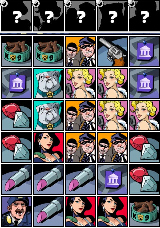 Poliziotto, cane, due gangster, Pearl, Madam Venom. Tutti questi simboli sono uguali e valgono fino a 100 volte la puntata.