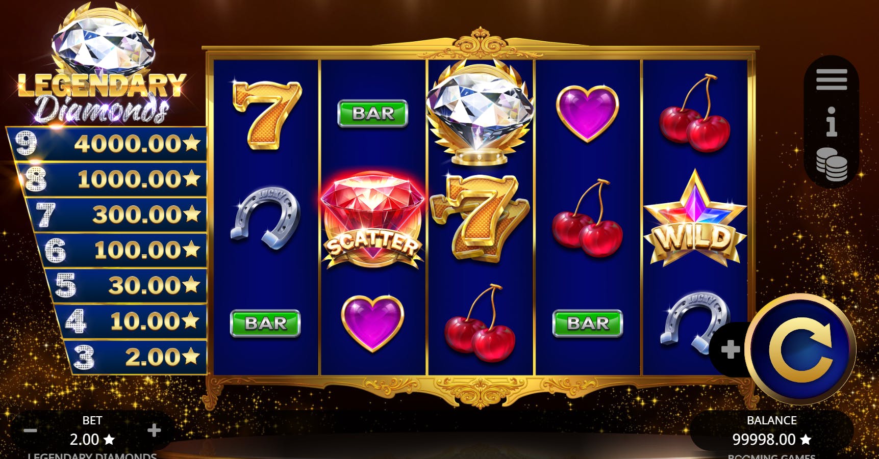 Non capita spesso di trovare delle slot con un gameplay essenziale ma che riescano ad essere anche coinvolgenti. Con Legendary Diamonds il provider Booking Games ci è riuscito. Il layout con 5 rulli e 3 righe ospita 20 linee di pagamento fisse su cui costruire le nostre combinazioni paganti utilizzando diversi simboli. Quelli meno generosi sono la scritta BAR, il ferro di cavallo, le ciliegie e il cuore, mentre nel gruppo dei più remunerativi troviamo le varie tipologie di numeri 7 (singoli, doppi, tripli e quadrupli).