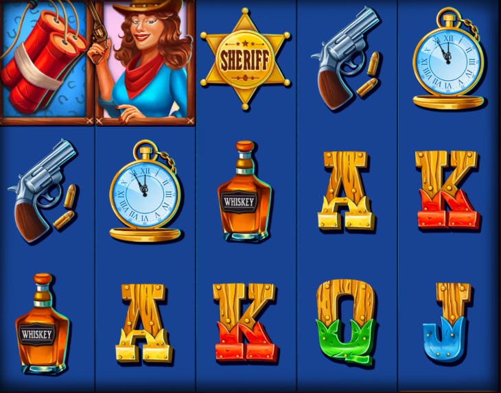 La griglia ha una forma 5×3 con 243 modi per vincere, che si ottengono associando da 3 a 5 simboli identici. Quelli di minor valore sono le carte da gioco dal J all’A, seguiti dal whiskey, dall’orologio, dalla colt, dalla distintivo dello sceriffo e dalla ragazza. Lo sceriffo è il Wild e sostituisce tutti i simboli base, invece i candelotti di dinamite regalano una vincita istantanea compresa tra 1x e 500x.