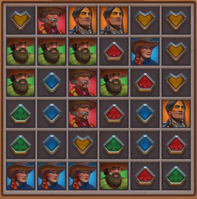 - Simboli ad alto pagamento: Le icone di valore più alto sono i 4 componenti della banda. La ragazza (blu) paga minimo 0,10x e massimo 25x; il cecchino (verde) paga minimo 0,12x e massimo 40x. Gli ultimi due simboli pagano anche con soli 8 simboli: l’indiano (arancione) paga da 0,10x a 50x mentre il negromante (rosso) ricompensa con minimo 0,12x e massimo 100x.