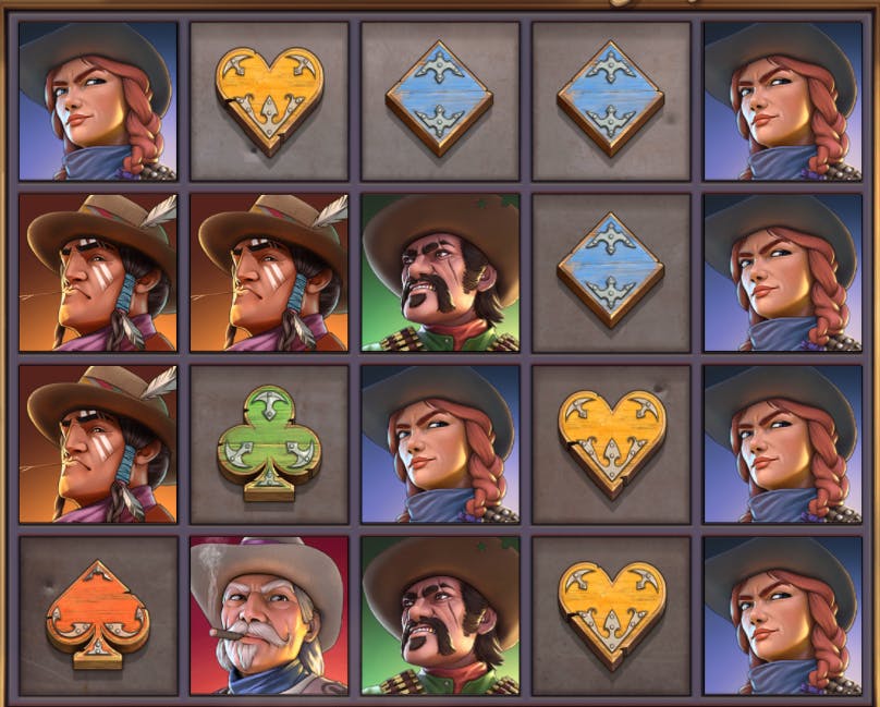 - Simboli di alto valore: i componenti della banda sono le icone che pagano di più. Con la ragazza (blu) si può guadagnare sino a 8x la puntata, con il cowboy (verde) si arriva a 9x, l’indiano (arancione) ricompensa con 10x e il boss (rosso) con 20x.