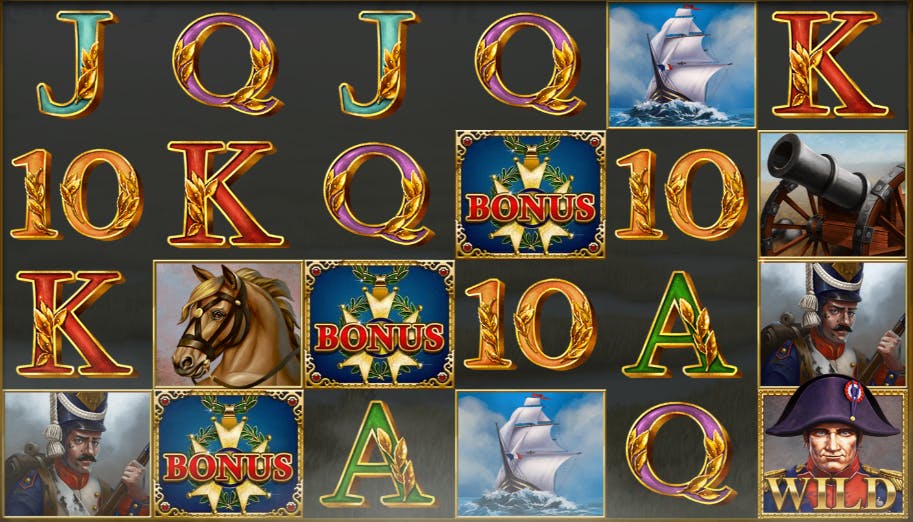 Per quanto riguarda i simboli speciali, uno dei più interessanti è il Wild. Rappresentato da Napoleone in persona, ne esiste una variante regolare e uno circondato da una cornice d’oro. Entrambi sostituiscono tutti i simboli e possono attivare un moltiplicatore x2, x4, x8, x16 e x32. Quello dorato però blocca tutti simboli vincenti e gli Scatter e sostituisce i simboli perdenti con altri del tutto nuovi.