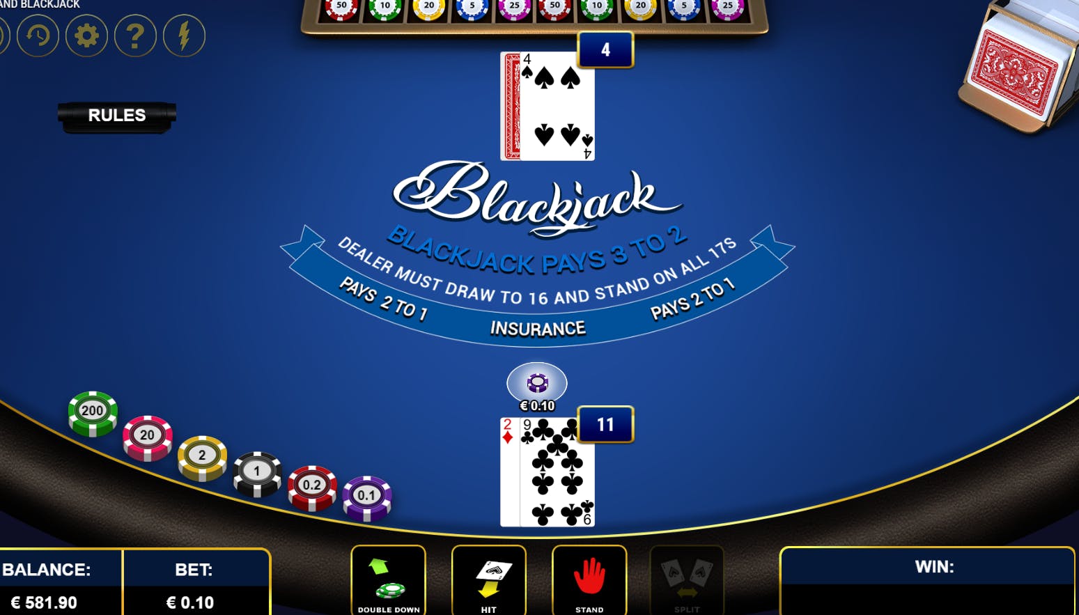 Con One-Hand Blackjack, il provider GameArt ci porta su un vero tavolo da gioco verde e ci sfida a una mano di Blackjack. Questo gioco di carte, che in Italia prende il nome di ventuno, ha regole semplici. L’obiettivo è battere il punteggio del banco senza però superare ventuno. Dopo un giro di carte, il giocatore può decidere se “stare” o se richiedere un’altra carta per incrementare il punteggio. Se il punteggio del mazziere è più basso o supera ventuno, allora il giocatore otterrà una vincita. Viceversa se il punteggio del giocatore è più basso o supera ventuno, allora vincerà il banco. One-Hand Blackjack utilizza 6 mazzi da 52 e segue anche le altre regole del gioco reale: si può raddoppiare la puntata quando ci sembra di avere in mano carte particolarmente fortunate, o dividere due carte identiche in due mani separate. Quest’ultima opzione vale anche se ci capitano due figure diverse come ad esempio Re e Jack. L’utilizzo di 6 mazzi rende più complicato il conteggio delle carte da parte del giocatore. Se sei un vero amante del blackjack, non puoi non provare questo gioco.