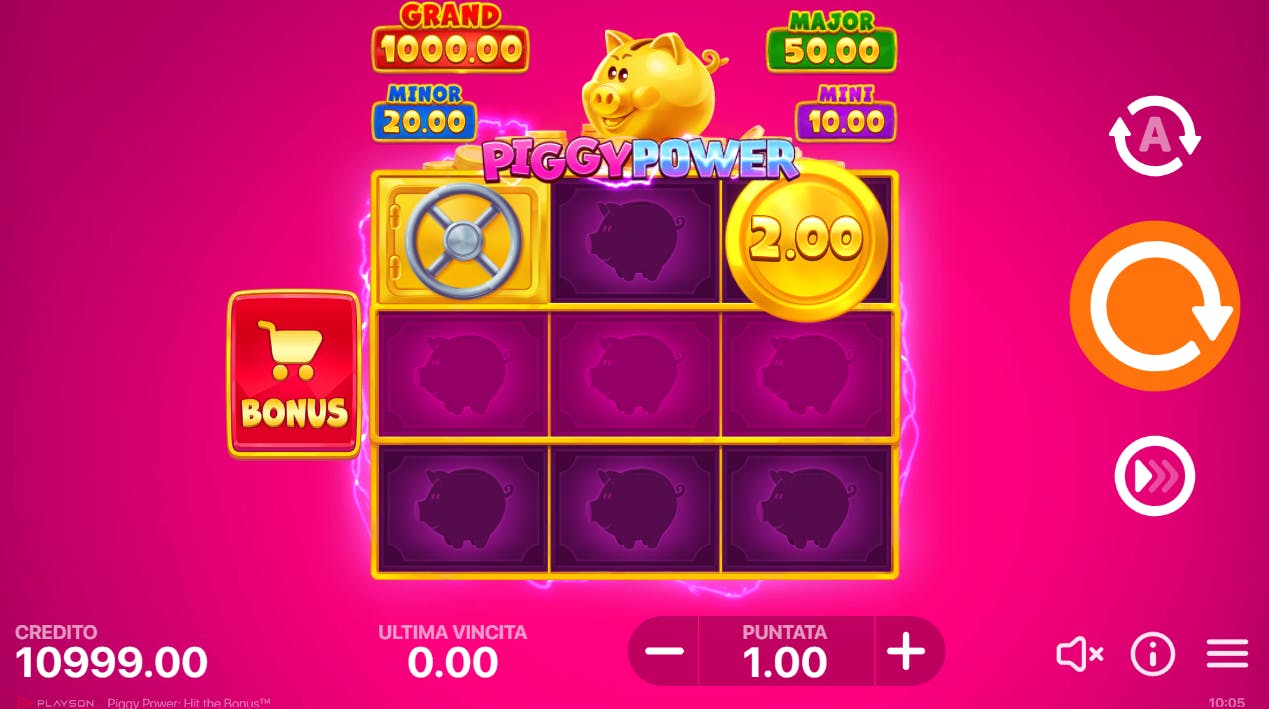 Il punto di forza di Piggy Power: Hit the Bonus, la nuova slot di Playson, è la semplicità. Sulla grigia 3×3 possono atterrare soltanto 3 simboli: moneta, cassaforte, Boost. Le monete hanno un valore compreso tra x1 e x4, mentre le monete-Sticky valgono tra x5 e x9 e rimangono incollate ai rulli sino a quando l’arrivo di tre simboli sul rullo centrale non attiva il gioco bonus. Quando partono i 3 respins, ogni moneta che atterra rimane in posizione e riporta il conteggio dei giri al valore iniziale. Se atterra un simbolo Boost, tutte le monete presenti in quel momento vengono raccolte e si ottiene subito una vincita. Il simbolo della cassaforte argentata rivela una moneta o un Boost, quella dorata mostra invece uno dei 4 jackpot disponibili. Durante il gioco si possono ottenere moltiplicatori casuali.