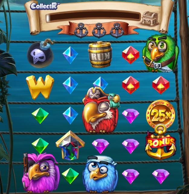 Diamanti e pappagalli sono gli indiscussi padroni di casa di “Pirots”: i simboli presenti in griglia gravitano attorno a questi due elementi, con i secondi che saranno impegnati a dare la caccia ai primi volando per tutto lo schermo.
