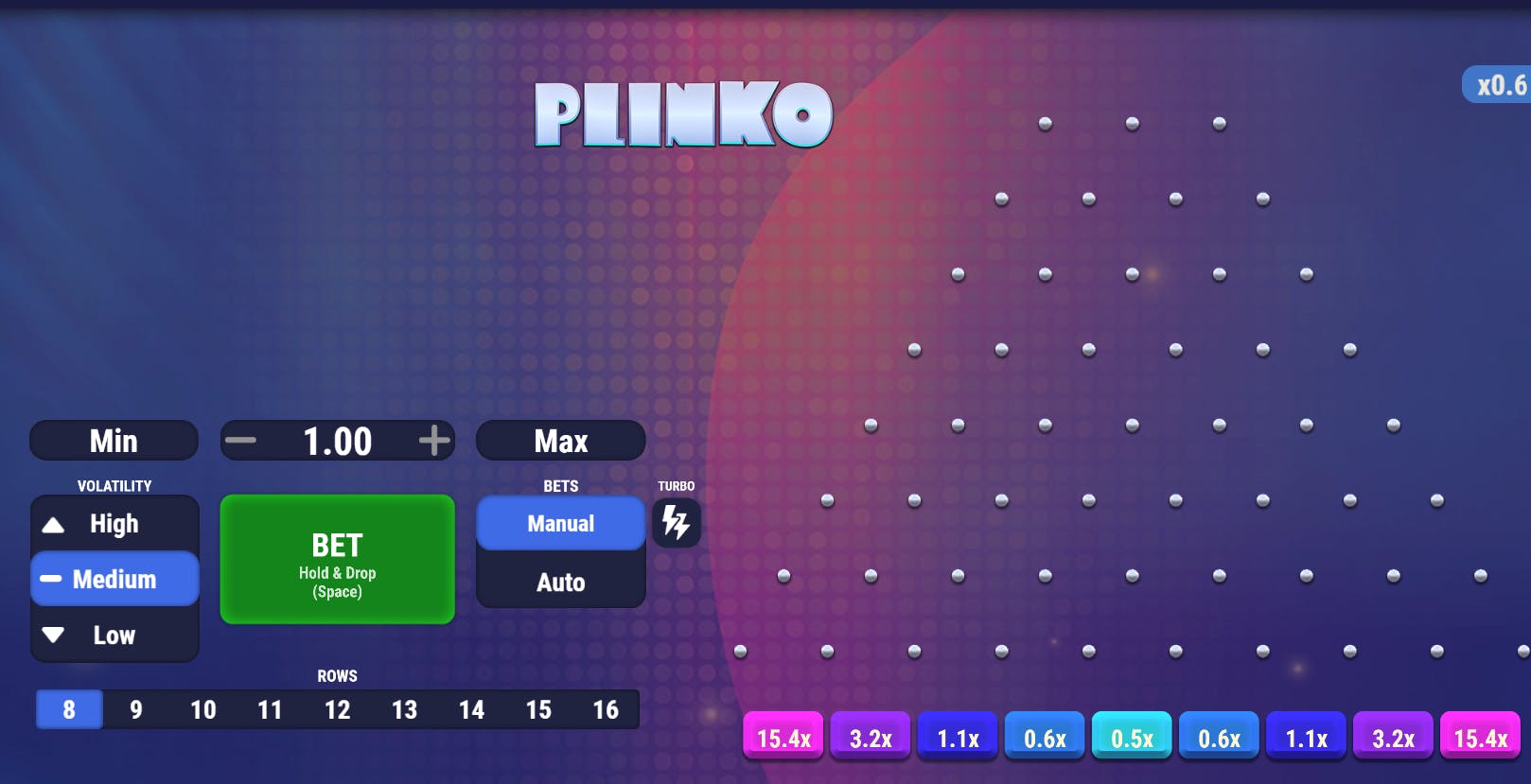 Lo sviluppatore GameArt propone la sua idea di gioco “casuale” con Plinko. La schermata principale mostra una piramide fatta di pioli con alla base alcuni moltiplicatori. Una pallina cade dall’alto e prenderà direzioni casuali via via che scende verso il basso. Il moltiplicatore colpito dalla pallina determinerà la vincita. Prima di avviare la partita il giocatore dovrà però impostare la scommessa, ma anche il livello di volatilità. La scelta inciderà direttamente sul valore dei moltiplicatori: più è alta la volatilità, di maggior valore saranno i moltiplicatori. Oltretutto, lo scommettitore può anche decidere il numero di linee con cui giocare. Un numero maggiore di linee comporta una base più grande e conseguentemente una quantità elevata di moltiplicatori. Per determinare le vincite bisogna moltiplicare la puntata per il moltiplicatore colpito, che sarà più alto ai lati.Presente la funzione Turbo e Autoplay.