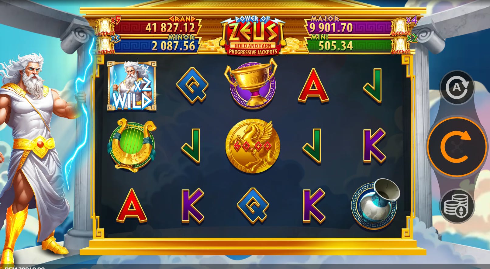 I 4 jackpot progressivi visibili nella schermata principale aumentano di valore ad ogni puntata e possono essere vinti attraverso un gioco bonus in cui gli unici simboli presenti sono una moneta con l’effigie di Pegaso e quelli con la dicitura Jackpot. Le monete hanno un moltiplicatore compreso tra 1 e 10, i simboli Jackpot servono per vincere uno dei quattro premi cashpot disponibili. Si parte con 3 respins, ma ogni volta che atterra un simbolo speciale, il numero di giri viene riportato all’origine.