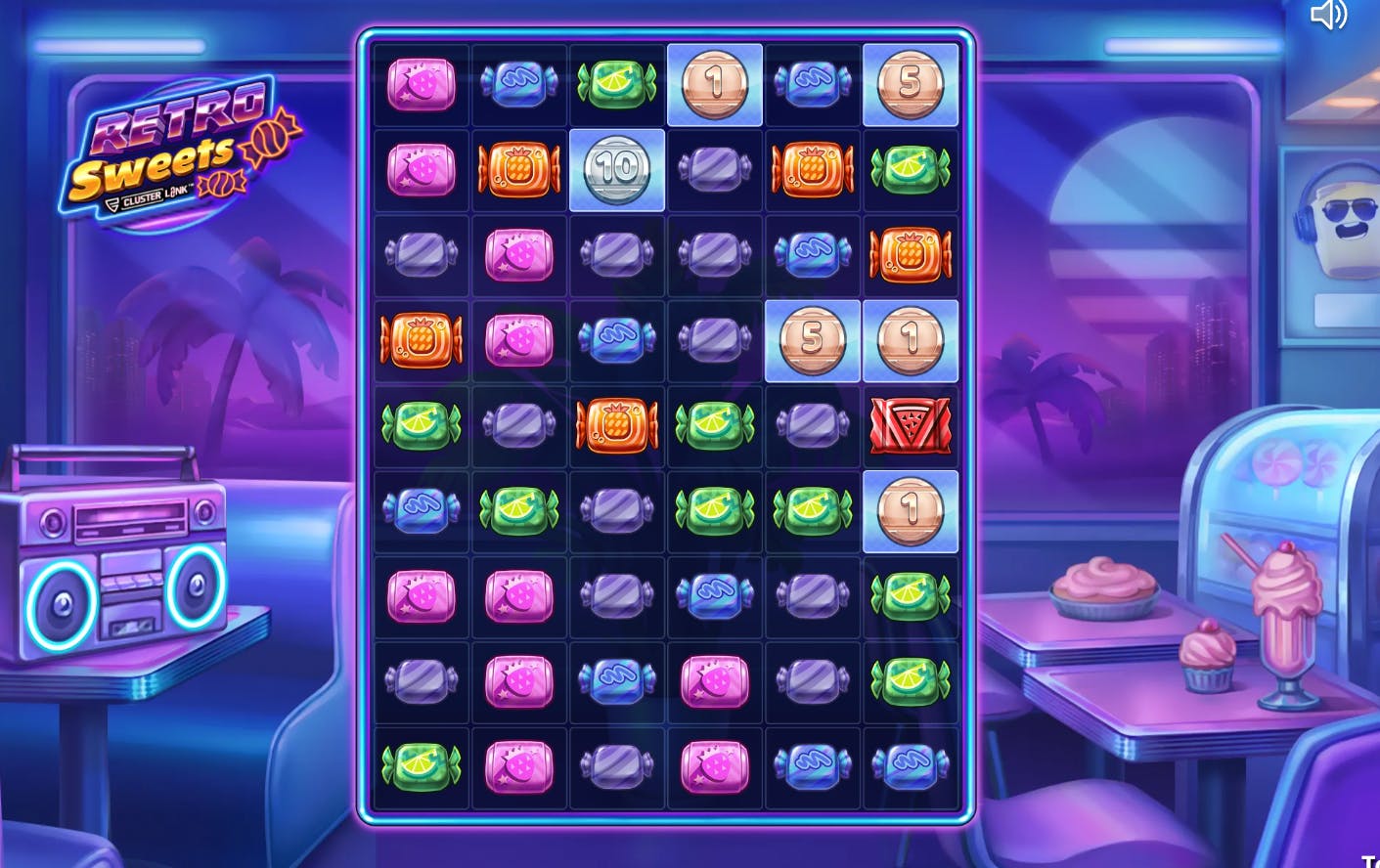 Slot dal sapore nostalgico, Retro Sweets di Push Gaming adotta una grafica soft, con colori scuri che creano un’atmosfera rilassante. Sistemata in mezzo ai tavolini di un lounge bar, troviamo una griglia con 6 ruoli e 9 righe. Layout di simili dimensioni sono sempre prerogativa del metodo a cluster. e infatti anche in questo caso si vince creando raggruppamenti di almeno 6 simboli identici che poi vengono rimossi e sostituiti da altre icone cadute dall’alto.