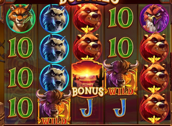Lo scorcio del Canyon è lo Scatter e ne servono 3 per attivare i giri gratis, ma nel caso ne atterrino solo due, allora l’ultimo rullo effettuerà un respins per offrire una chance di ottenere il terzo. Durante i giri gratuiti i simboli Wild si spostano di posizione ad ogni giro, inoltre ogni bisonte dorato che arriva aumenta di +1 il moltiplicatore. Se due Wild atterrano nello stesso punto, allora vengono assegnati altri due giri gratis.