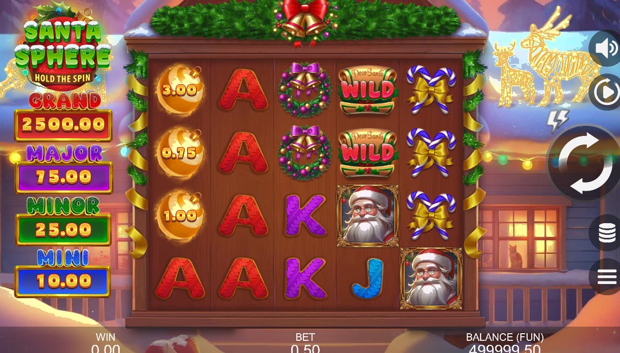Dal punto di vista grafico, Santa Sphere: Hold the Spin è un piacere per gli occhi. Tutto serve a comunicare pace e serenità, a partire dal tetto innevato della casetta di legno con le sagome illuminate delle renne, il gatto che dalla finestra illuminata osserva la neve, i simboli a tema natale. La griglia di gioco è dotata di 5 rulli e 4 righe e ha ben 40 linee di pagamento.