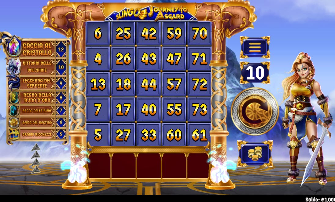 Da un po’ di tempo è facile imbattersi nei giochi slingo, quelli che fondono il gameplay delle slot con quello del Bingo. Nel caso di Slingo Journey to Asgard giocheremo su una griglia 5×5 su cui sono presenti 25 numeri. Ad ogni partita, cinque numeri verranno estratti nel rullo orizzontale in basso e quelli sulla colonna corrispondente saranno sostituiti da un emblema. Con una serie di 5 simboli, orizzontale o verticale, si ottiene una vincita e si avanza verso la pila di bonus visibile alla sinistra del layout. Non solo numeri però, perché nel rullo inferiore può comparire anche un Wild che ci permette di eliminare un numero qualsiasi dal rullo corrispondente, o il Super Wild che ci dà la possibilità di compiere la stessa manovra ma sull’intera griglia. Ogni simbolo free spins che arriva aggiunge uno spin aggiuntivo da giocare alla fine di quelli regolari.