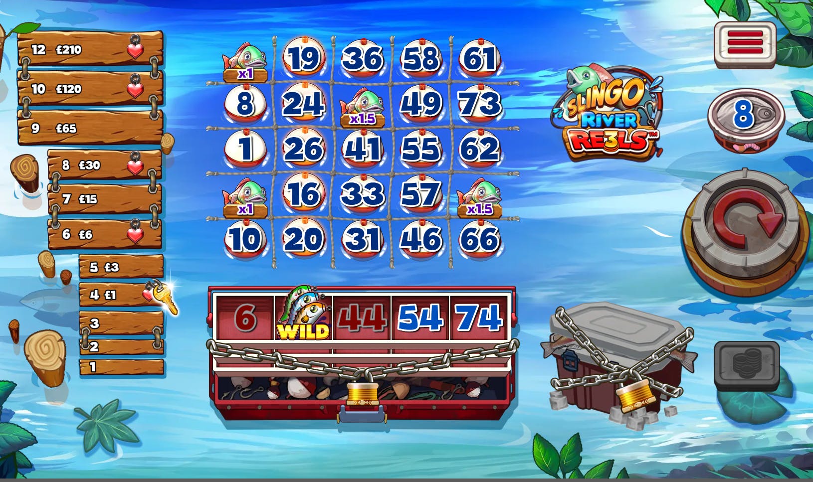 Il gioco Slingo River Re3ls ha una griglia 5×5 su cui sono presenti 25 galleggianti numerati. In basso c’è la cassetta degli attrezzi con 5 riquadri in cui verranno mostrati i numeri estratti. Se questi combaciano con quelli sul rullo corrispondente, allora il galleggiante rivela un pesce dotato di moltiplicatore. Sul rullo orizzontale può apparire anche un simbolo Wild che consente di rimuovere qualsiasi numero sulla colonna relativa, o il Super Wild, che permette di farlo su tutto il layout. Dopo la quarta Slingo, ossia serie di 5 simboli adiacenti in verticale, orizzontale o diagonale, si ottengono i Respins Pescatore. Parte quindi la funzione Re3ls durante la quale se il pescatore appare impilato, raccoglie i moltiplicatori delle slingo.