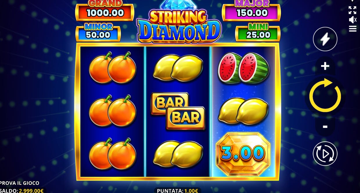 Nella slot Striking Diamond il tema della frutta si fonde con quello della ricchezza. La grafica è essenziale ma superlativa, utilizza colori brillanti e simboli colmi di dettagli. Il layout 3×3 ha 5 linee di pagamento fisse su cui atterrano diverse tipologie di simboli: quelli meno generosi sono le ciliegie, a seguire troviamo le prugne, i limoni e le arance e subito dopo uva e anguria. I pagamenti migliori sono legati alle scritte BAR, alle campane e ai numeri 7, con quest’ultimi che ricoprendo anche il ruolo di Wild, vanno a sostituire tutti i simboli eccetto quelli speciali.