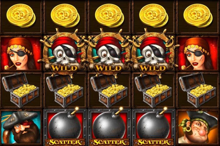 La griglia di gioco è una 5×4, a cui si aggiunge un rullo orizzontale superiore di cui vedremo a breve la funzione. Si vince quando da 3 a 5 simboli identici atterrano su una delle 25 linee di pagamento. A pagare meno sono le carte da gioco dal 10 all’A, mentre il doblone, le pistole, la boccetta di rum, il tesoro e i 3 pirati offrono ricompense molto più generose. Il simbolo più remunerativo è il teschio, che ricopre anche il ruolo di Wild andando a sostituire tutti i simboli ma non lo Scatter. Proprio lo Scatter è l’elemento centrale del gioco: se compare sulla griglia e sul rullo orizzontale atterra un Wild, allora vengono aggiunti Wild casuali ai rulli. Se invece lo Scatter appare con i tre pirati, allora questi ultimi sostituiscono i simboli di minor valore. Scatter + cassa offrono un premio compreso tra 5x e 1.000x, mentre con il doblone la ricompensa è pari a 10x.