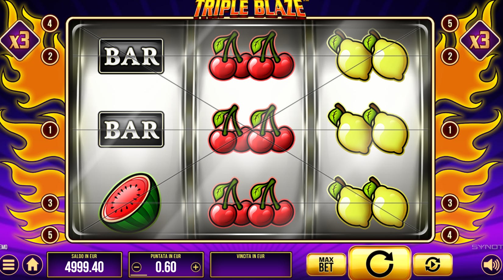 Griglia 3×3, 5 line di pagamento fisse, puntate contenute, sono gli elementi che rendono Triple Blaze di Synot Games una slot tradizionale. Il range di scommessa è compreso tra 0,10 € e 200 €, mentre la vincita massima è di ben 125.000 €. Quando tutti i rulli vengono riempiti con lo stesso simbolo viene attivata la funzione speciale Full Reels Multiplier, che moltiplica per 3 la vincita. Ogni somma ottenuta può essere rigiocata con la funzione Gamble: indovinando il colore della carta estratta dal mazzo l’importo viene raddoppiato, ma se si sbaglia, si perde tutto. Buono il ritorno teorico al giocatore (RTP), pari al 96,09%.