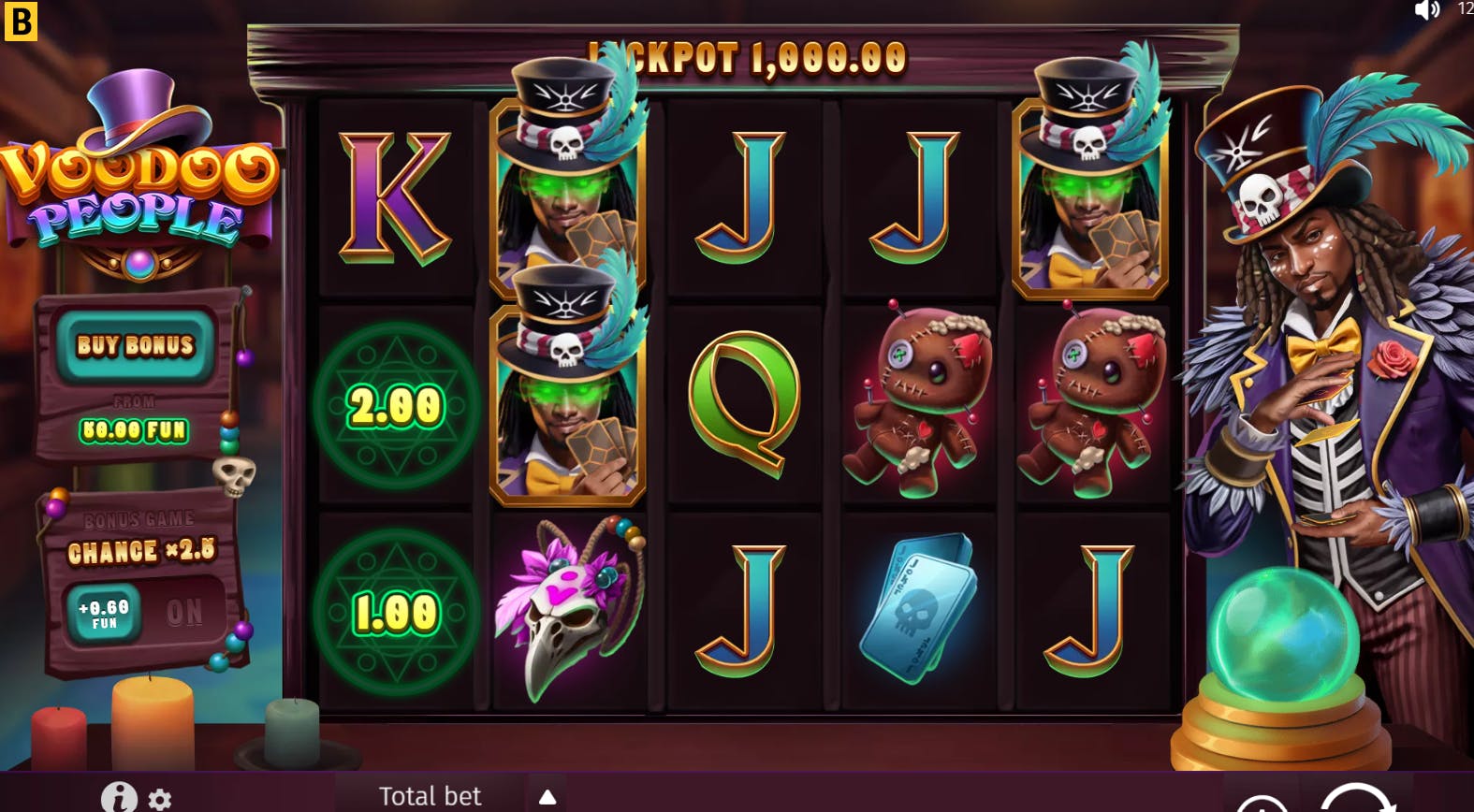 Voodoo People è una slot 5×3 con 25 linee di pagamento fisse, un RTP del 96,88% e una volatilità medio-alta. L’ottima grafica ha uno stile cartoon ed è ricca di dettagli. Lo stregone è il simbolo Wild e sostituisce tutti i simboli eccetto lo Scatter e il simbolo Voodoo. Il fantoccio è invece il nostro Scatter e ricompensa con 8 giri gratis durante i quali gli unici simboli in gioco saranno quelli di alto valore. Con 3 Scatter vengono assegnate ulteriori partite gratuite.