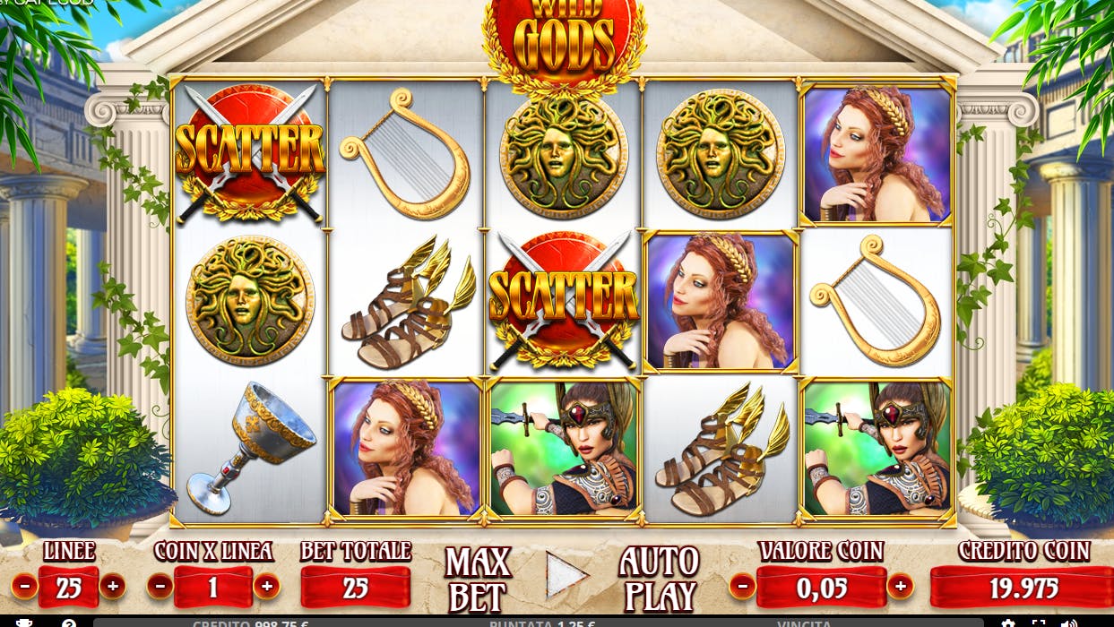 Se volete un gioco pieno di emozioni, puntate su Wild Gods, la slot di Capecod che offre un gameplay emozionante dotato di un sistema di bonus di sicuro interesse. Andiamo però per gradi. Il gioco ha una griglia 5×3, su cui sono attivabili massimo 25 linee di pagamento. I simboli di gioco rimandano tutti alla mitologia greca. La coppa degli dei, l’arpa, le calzature alate e lo scudo di Medusa sono i simboli con un rendimento più basso, mentre ben più generosi sono il tempio dimora degli dei, Atena, Achille, Afrodite e infine Zeus. In questo gioco trovano spazio due tipologie di Wild, uno semplice e uno dotato di moltiplicatore. Naturalmente e entrambi ricoprono la funzione di Jolly sostituendo tutti i simboli tranne lo Scatter.