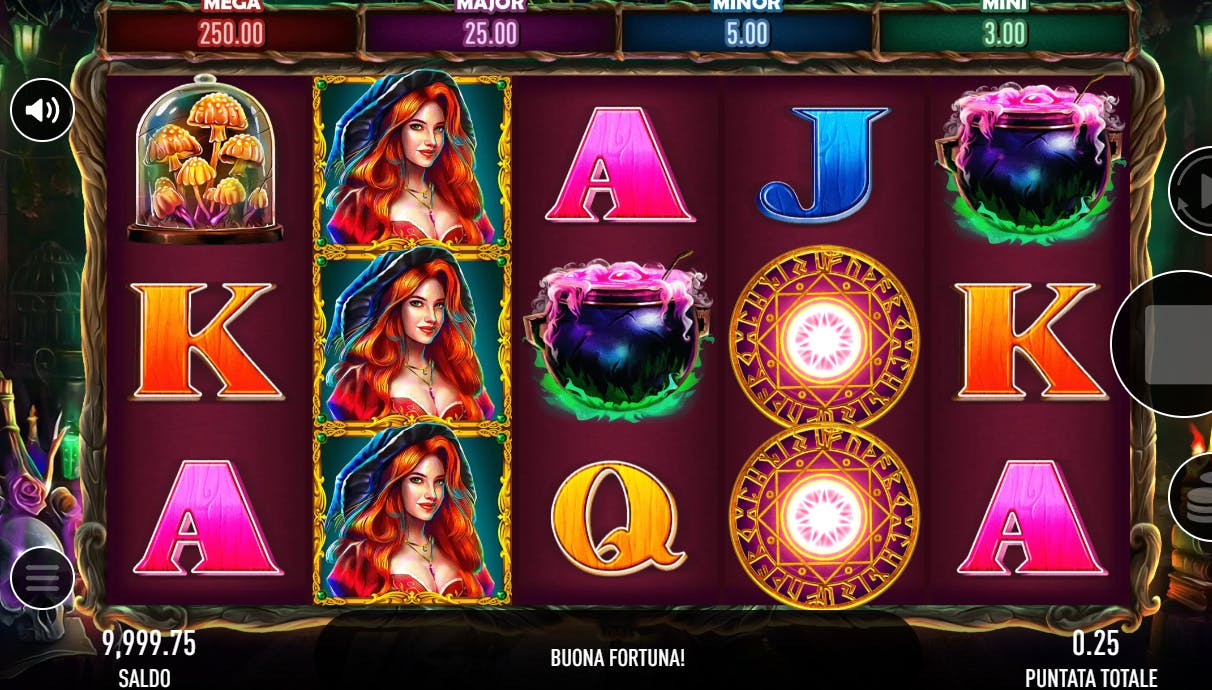 La strega è il Wild del gioco e aiuta ad ottenere una vincita sostituendo tutti i simboli base se coinvolto in una serie vincente. Il gatto nero è invece lo Scatter e come da tradizione dà avvio ai free spins, durante i quali il cerchio magico si comporta da Wild e sostituisce tutti i simboli regolari. Naturalmente c’è anche la strega Wild, ma a differenza del gioco base, qui appare impilata.