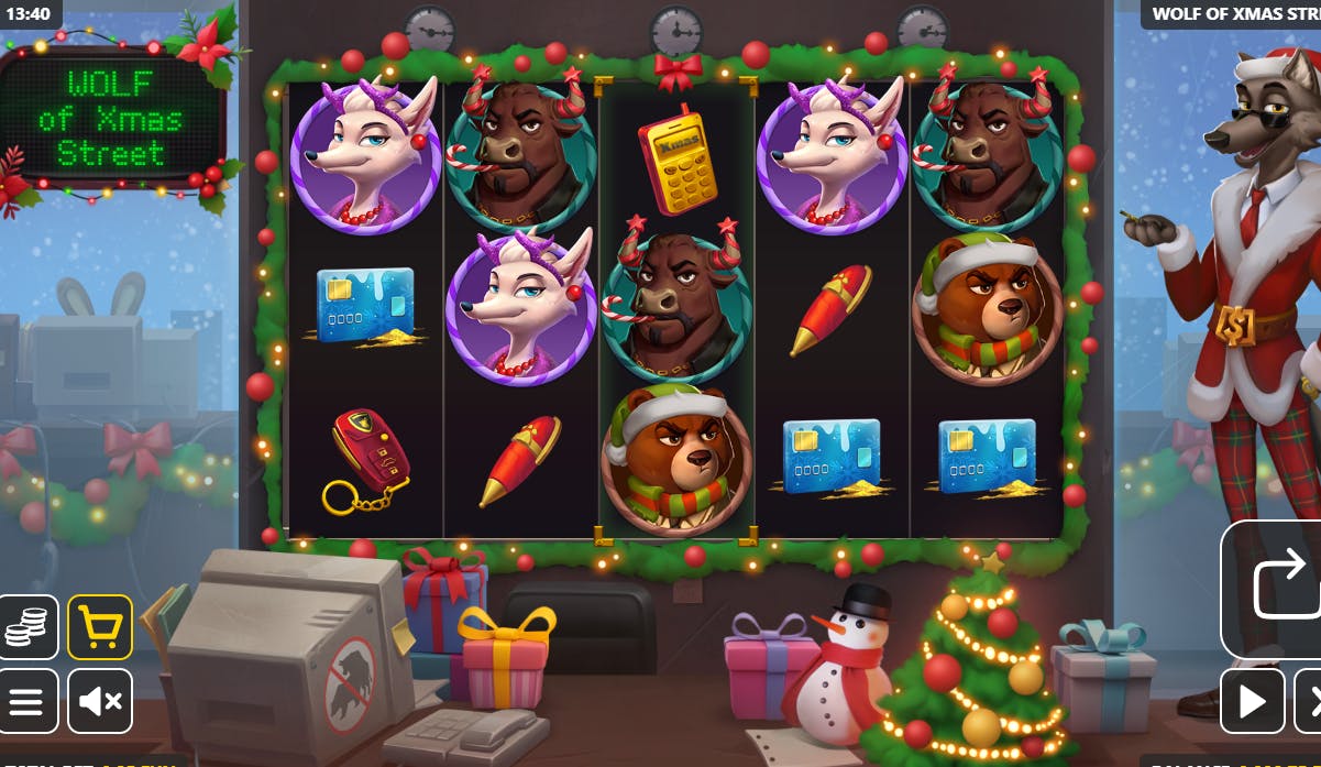 Ricca di colori e con una grafica ricercata, Wolf of Xmas Street è la slot perfetta con cui festeggiare il Natale. L’ambientazione è un ufficio addobbato con luminarie e decorazioni sorvegliato dal lupo-manager travestito da Babbo Natale. E proprio sulla scrivania capeggia la griglia 5×3 con 25 linee di pagamento fisse da utilizzare per costruire le vincite. I simboli regolari sono 8, in ordine di valore troviamo la calcolatrice, la penna stilografica, la chiave elettronica di una fuoriserie, la carta di credito e i quattro personaggi (cagnolino, orso, toro e gatto).
