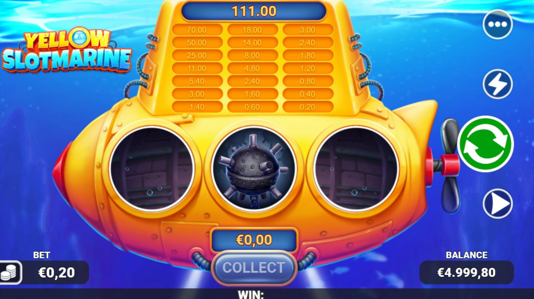 Se sei alla ricerca di qualcosa che si discosti dalle classiche slot, allora Yellow Slotmarine può essere l’idea giusta. La schermata principale è composta da un grande sottomarino con 3 grandi oblò al centro e sopra una scala di 7 importi di valore crescente (Cash Meters). Quando atterra uno dei 3 personaggi, il primo importo sull’oblò corrispondente si illumina. Noi potremo decidere di raccogliere il premio attraverso il tasto Collector oppure di proseguire. Quando successivamente atterrerà lo stesso personaggio verrà evidenziato l’importo superiore e di nuovo potremmo decidere se incassare o andare avanti. I personaggi, in ordine di valore, sono il cuoco (misuratore di destra, verde), l’avventuriera (misuratore centrale, rosso) e il capitano (misuratore di sinistra, viola).